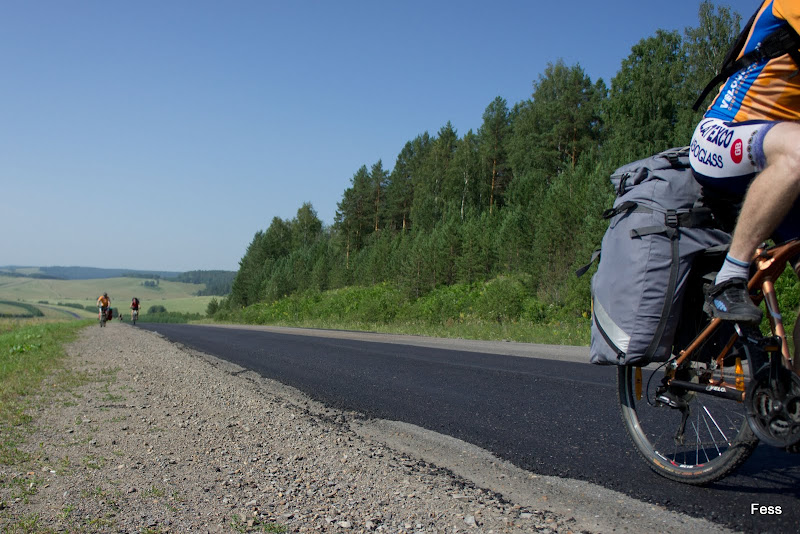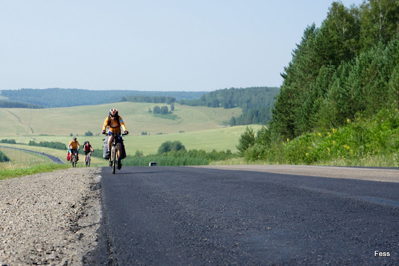 Не менее непримечательным было и начало пути – перетащили велы через мост над жд и покатили. Ехалось хорошо, душевно – под горку, легкий попутный ветерок, более-менее привычный асфальт… Смущал разве что Вег, который из-за болей в колене ехал на совсем легких передачах, и поэтому напоминал швейную машинку. В попытке как-то ускорить и обегчить ему движение, на повороте на Малояз сделали ему «туклипсу», примотав сланец (да, он ехал в розовых сланцах) к педали. Это помогло, но не сильно. Попутно все ушлые участники обновляли слой солнцезащитного крема – солнце явно отыгрывалось за пасмурный июнь.